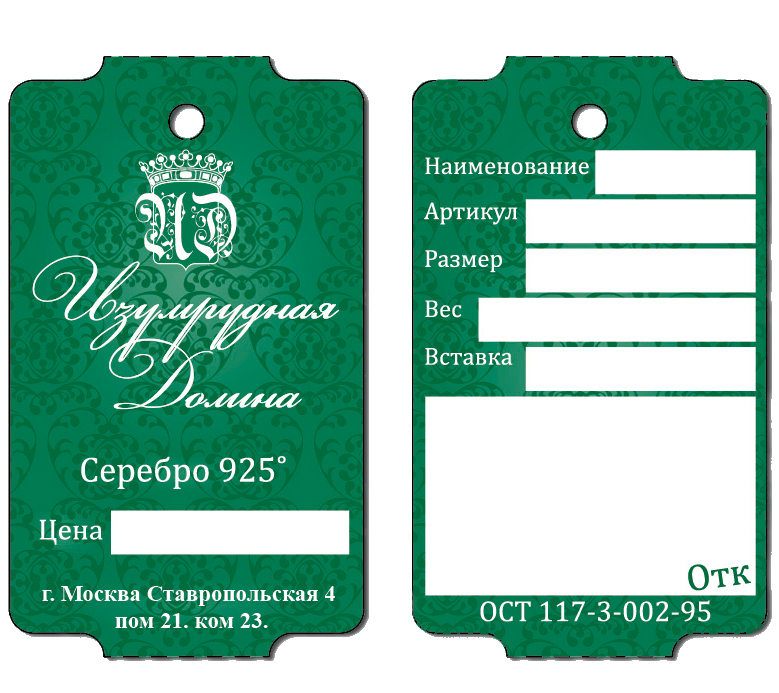 Маркировка ювелирных изделий — не только способ идентификации товара, но это еще и выгодный способ подчеркнуть имидж и стиль компании-производителя. Ювелирная продукция, снабженная красивыми бирками с четким читабельным текстом, придаст солидности не только продаваемым изделиям, но и вашей фирме. Создайте неповторимый имидж вашего ювелирного бренда с нашими высококачественными этикетками и бирками!
